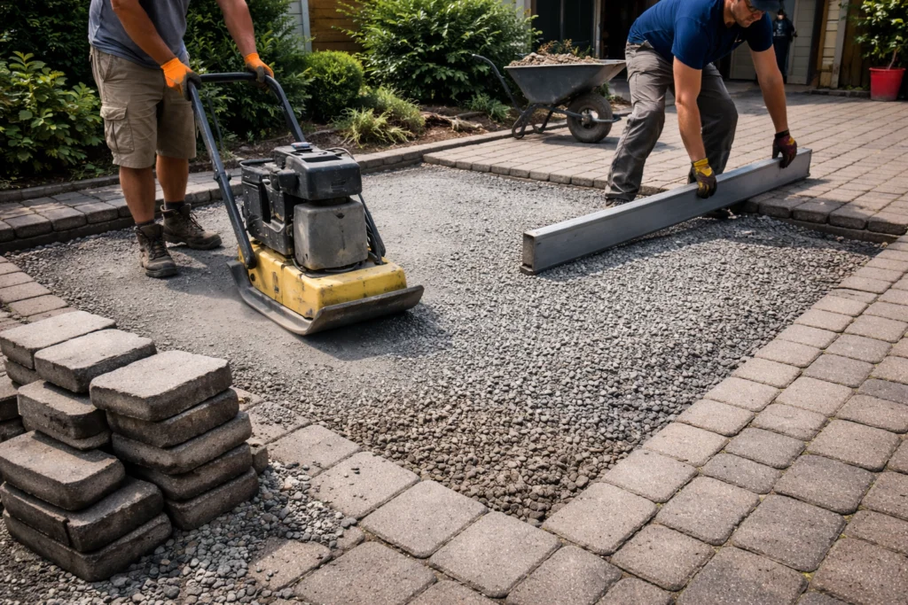 The process begins with carefully removing the pavers without damaging them. The unstable base material must then be excavated and replaced with compacted aggregate. Proper slope and drainage must be re-established before reinstalling the pavers.