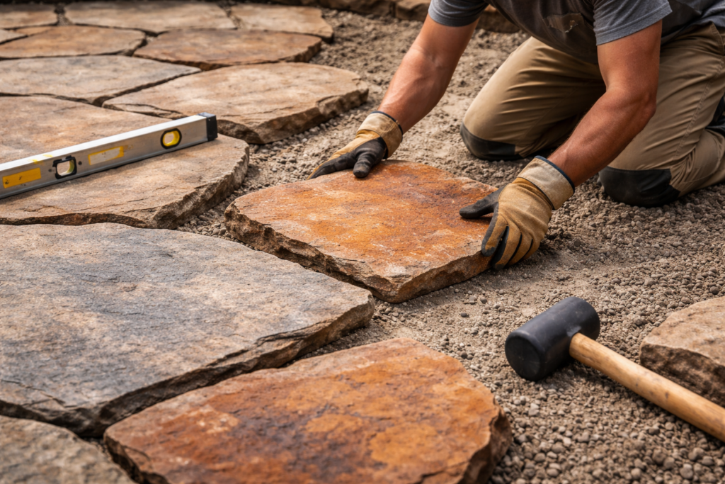 Installation is one of the most important parts of any flagstone project. Flagstone is not just heavy, it is also irregular. That means the installer must work with natural variation in shape, thickness, and edge profile. Layout planning matters more here than it does with modular concrete pavers.