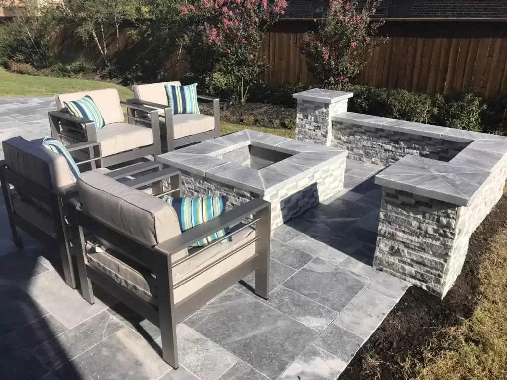 A more luxury design with light elements and elegant sitting arrangements. A comfy and rustic approach, with few elements and a lower fire pit. A more modern and minimalistic approach, taking advantage of the natural colors of the stone pavers.
